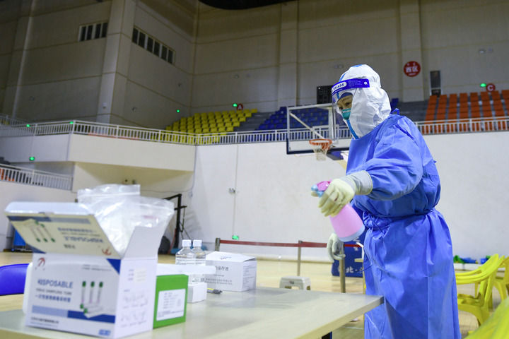 10月24日,东风镇中心卫生院护士卢美司在额济纳旗文体中心核酸采样点对桌面进行消杀。新华社记者 贝赫 摄