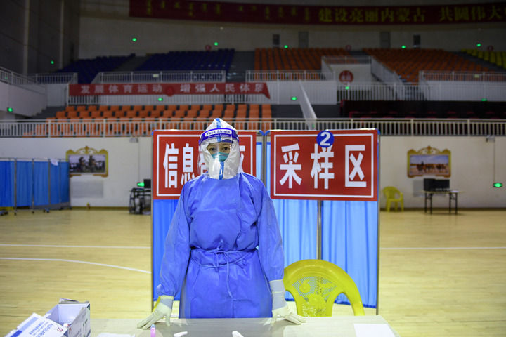 10月24日,东风镇中心卫生院护士卢美司在额济纳旗文体中心核酸采样点值守。新华社记者 贝赫 摄