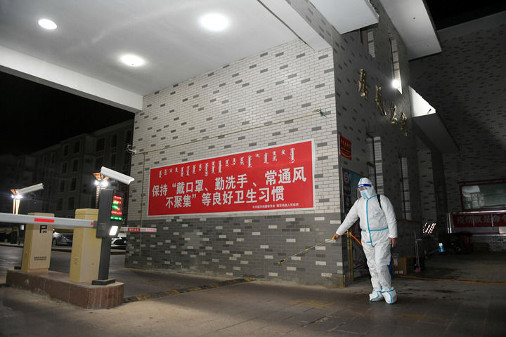 10月25日,额济纳旗林业和草原局工作人员在居延名郡小区外进行消杀工作。新华社记者 贝赫 摄