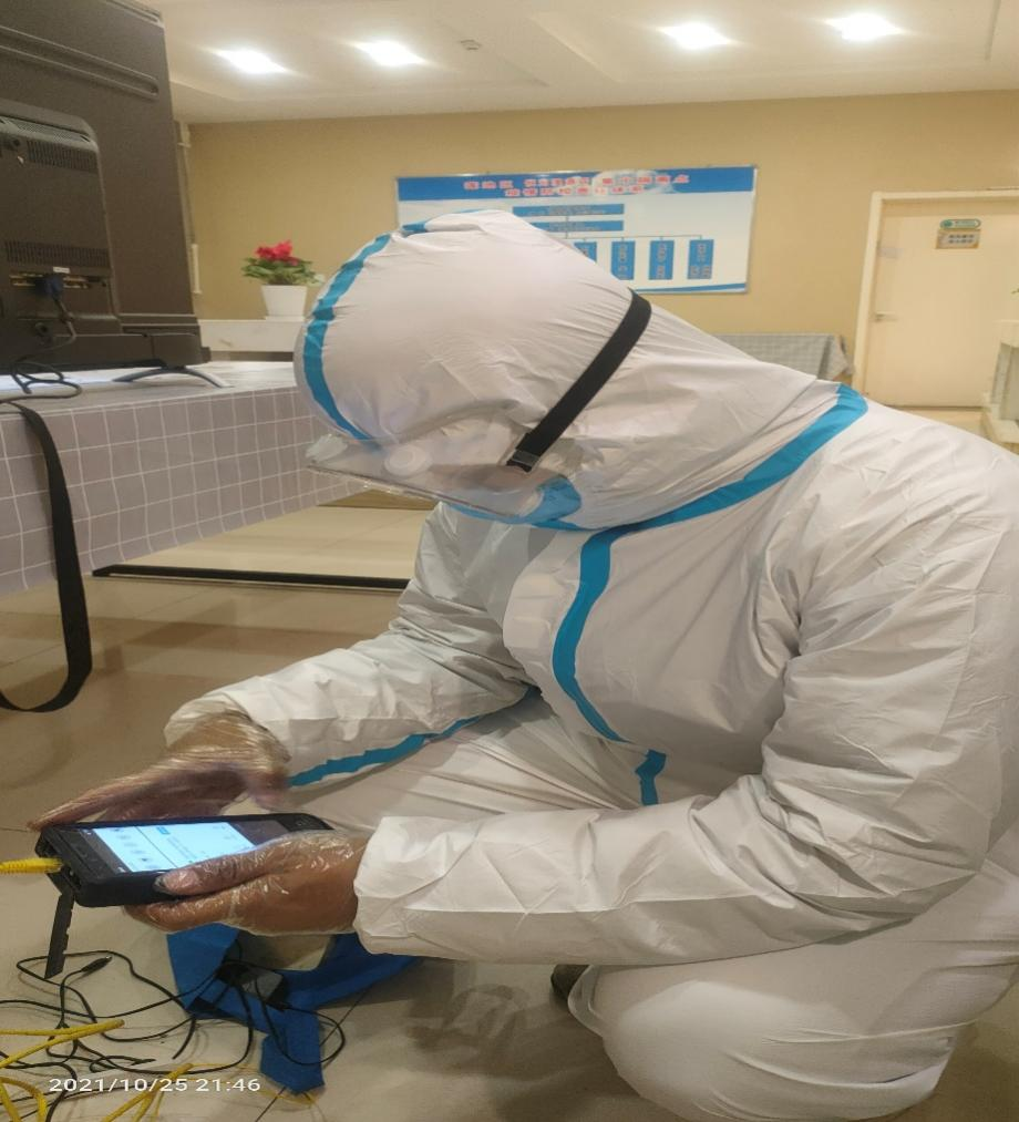 抵达现场后,三人迅速穿戴好防护服、做好防护措施,立即投入战斗。“疫情当前,我们一刻也不能耽误。”三人现场分工,组长王通负责带领一名组员勘察室外线路,规划线路接入点位置并制定装机方案,另一名组员负责整理装机设备。待事前工作准备完成后,三人进入隔离区进行装机。