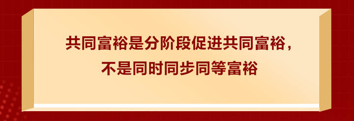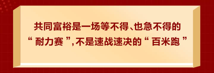 推动共同富裕就像一个人走路,两只脚一前一后才走得稳、走得远。如果两只脚齐步往前走,不仅走得很累,还容易跌倒。要分阶段促进,不能齐步走。不是所有人都同时富裕,也不是所有地区同时达到一个富裕水准,不同人群不仅实现富裕的程度有高有低,时间上也会有先有后,不同地区富裕程度还会存在一定差异。