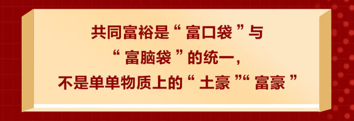 站在全面小康新的奋斗起点上,衡量一个地方的发展水平,反映一个人的富裕程度,精神文化生活是重要硬指标。现实表明,推动共同富裕,是物质生产力发展的过程,也是文化生产力发展的过程,而且文化越来越成为关键变量、决定性因素。“脑袋不富”眼里更多的是“柴米油盐”,“脑袋富了”心中就能装着“诗和远方”,“脑袋”“口袋”都富了才能有真正的获得感、幸福感、安全感。要在抓经济建设的同时,更加重视文化建设;在注重增加城乡居民收入的同时,更加关注人民群众精神力量的增强、文化生活的满足,推动形成与共同富裕相适应的价值理念、精神面貌、社会规范、文明素养,让人们在共同富裕中实现精神富有。