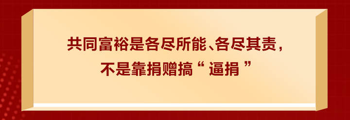 实现共同富裕需要人人出力、人人尽力,有余力的做慈善捐赠,是锦上添花的事情。但不能本末倒置,搞捐赠竞赛,甚至无形“劝捐”“逼捐”,要把精力花在各尽所能、各尽其责上。虽然三次分配主要通过慈善捐赠的方式进行,起到改善分配结构的补充作用。但“捐”不是初次分配的“酬”,也不是再分配的“税”,是在自愿而非强制的基础上进行的。在现阶段,推动共同富裕要各就各位,立足主业,回归本职,把各自从事的事情做得更好。