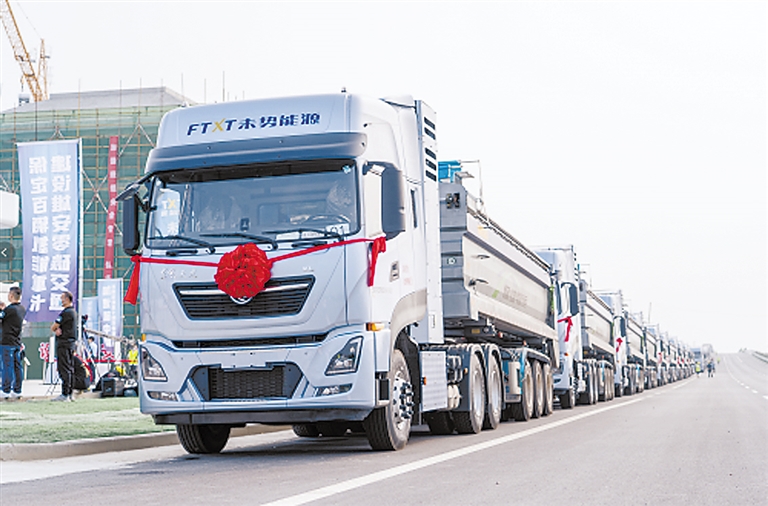 在长长的车队中,由商用车与未势能源公司合作推出的氢燃料电池牵引车,开始投入雄安新区建材通道“容易线”砂石骨料运输工作,在绿色服务雄安的同时,也为保定实现碳达峰、碳中和战略目标注入可靠动能。