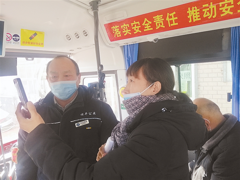 在公交车上司乘工作人员(左)查看乘客健康码。 杨昊璐 摄
