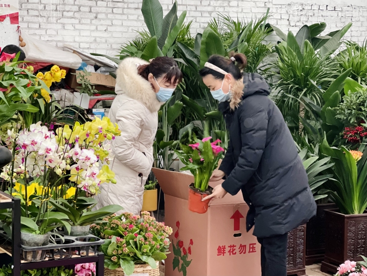 王明说,除了线下销售外,他还开拓了“鲜花到家”业务。每天会将花卉信息发到微信群中,顾客线上下单,他则为顾客配送。“这几天正是花卉销售高峰,每天能销售百余盆。”