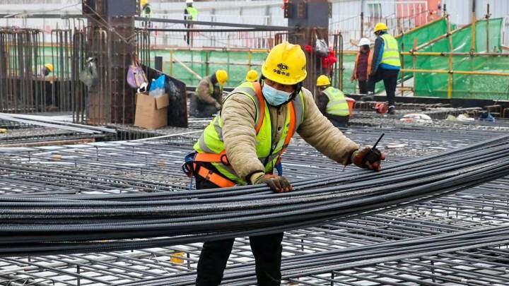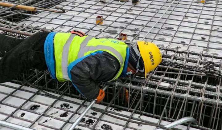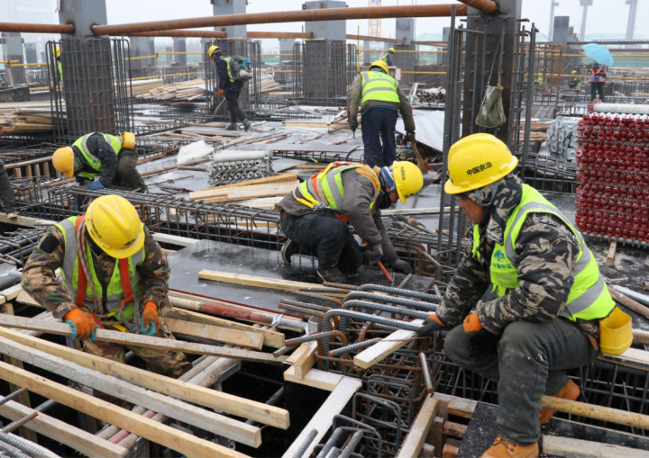 气温在零度以下徘徊,建设工人们毫不退缩,坚守岗位,抢抓进度。搭建好的钢结构需要在每根钢筋的交界处绑扎固定,钢筋工每三四个人一组,每天要完成一到两根钢筋梁绑扎工作。“你能看到现场有百余名工人在施工,其实在盖板下面,也就是项目地下施工部分,还有一百多名工人在奋战!”