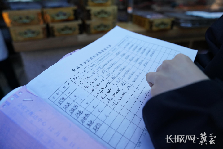 市场监管人员查看饭店食材台账。 长城网·冀云客户端记者 王日成 摄