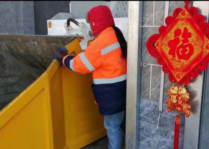 在韩庄智能压缩站内,台站工作人员刘金敏正拿着消毒剂对一车垃圾做着消杀工作。今年,是她春节坚守岗位的第14年。“越是过年,工作标准越不能降低,方方面面都要做好。”接车、消杀、清运、转运、冲地沟、擦箱子,刘金敏里里外外忙活着,认真且熟练。