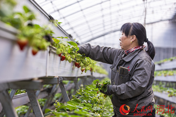 出香菇种植基地南行约3公里,就到了磁山二街的果蔬种植地。值守的工人赵师傅一按卷扬机按钮,罩在外层的棚布徐徐卷起。推开日光温室大棚的门,沿着用水泥铺垫的路走进草莓采摘棚里,一阵夹杂着草莓香气的暖风迎面扑来。大棚内一排排种植草莓的架子呈“A”字形,一垄垄草莓呈梯次立体排列。滴滴水珠通过智能滴灌系统润泽着秧苗,颗颗红宝般的草莓令人馋涎欲滴,绿叶间点缀着朵朵小白花,蜜蜂嗡嗡嘤嘤穿梭其间。