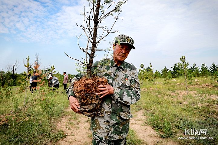 张连印与教育基地工人在北梁山坡种树,图为张连印正在搬运树苗。河北省军区 丁美宁 摄