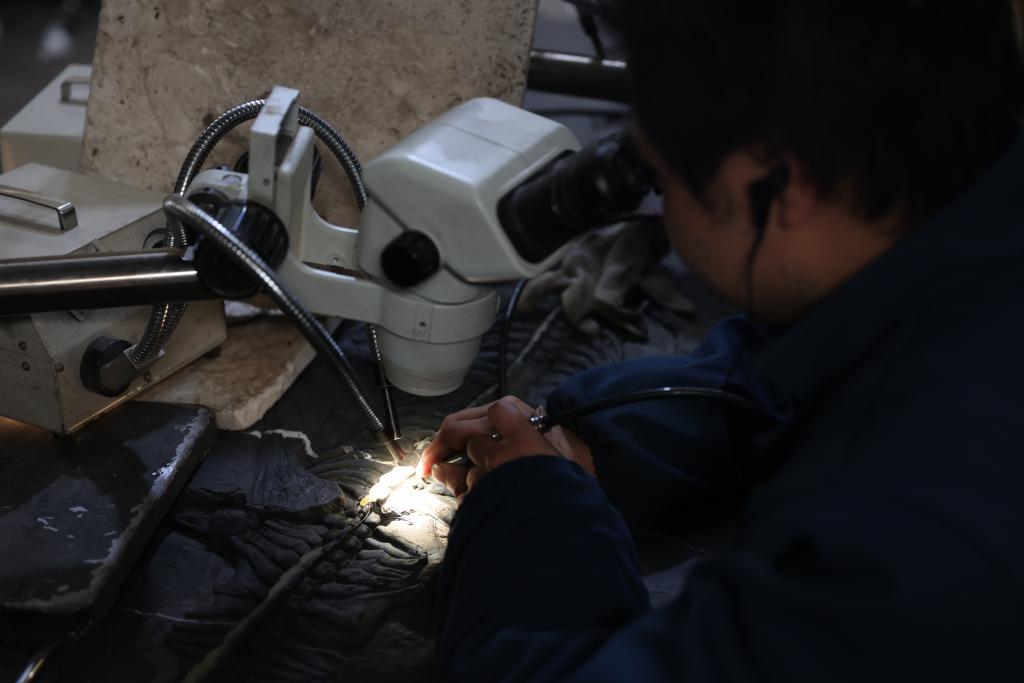 化石修复师正在剥开化石上的岩石。新华社记者杨欣 摄