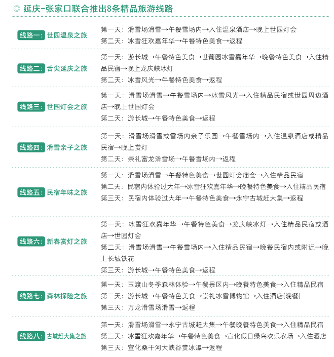 延庆区提出了以京张体育文化旅游带建设为契机,构筑以“春骑行、夏露营、秋路跑、冬冰雪”为特色的四季生态体育旅游线路和服务,形成全季候、全区域的体育旅游产业发展模式。张家口市积极发展崇礼户外运动线路,线路入选 “2019年十一黄金周体育旅游精品线路”,体现了崇礼多元化的体育文化、旅游文化。