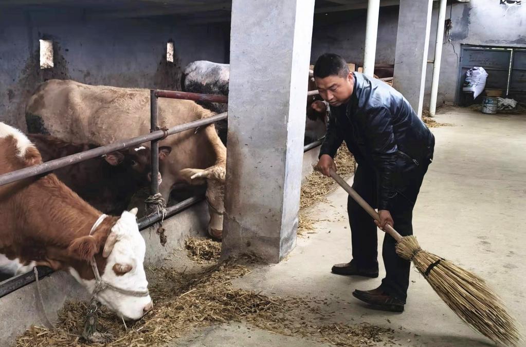 蒙忠鹏在自家养殖场喂牛。(受访者供图)