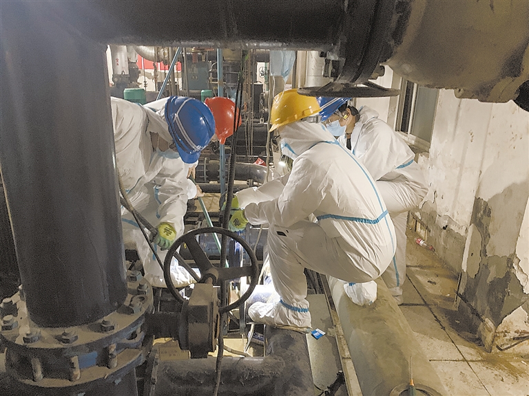 2021年10月30日,某封闭小区的换热站内循环泵入口处一对阀门漏水严重,5人双脚泡在水里一气干了两个小时,拆卸、更换新阀门到晚上9点,被防护服、工作服层层包裹的身上更是大汗淋淋,累得筋疲力尽。