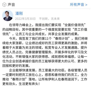 伊利董事长兼总裁潘刚在伊利内部宣布继续涨薪