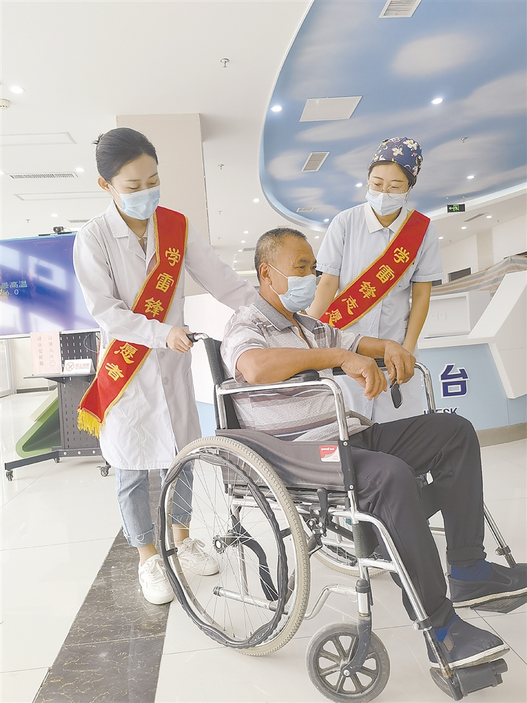 “阿姨,您坐这儿,我推您去挂号。”一楼门诊大厅内,导诊人员张静,看到一位拄着拐杖的老人独自前来就诊,她赶忙推上轮椅,迎上前去。