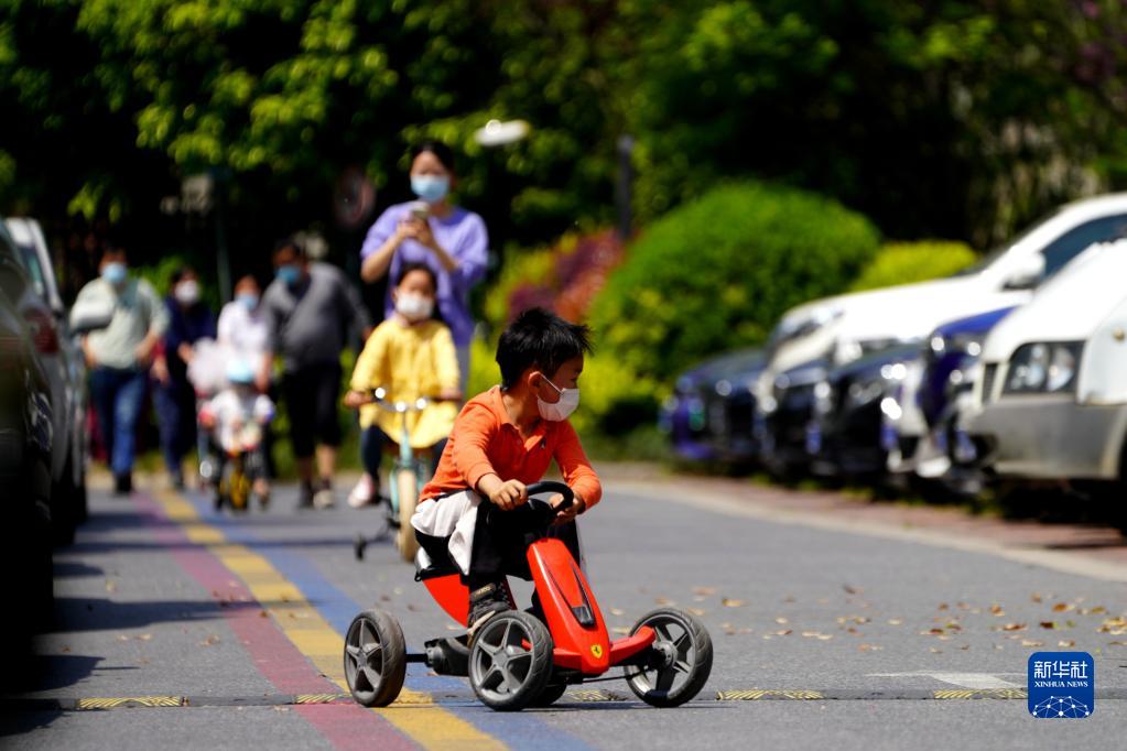 4月12日,在上海松江区洞泾镇被列入防范区的一个小区内,一名孩子在骑车玩耍。