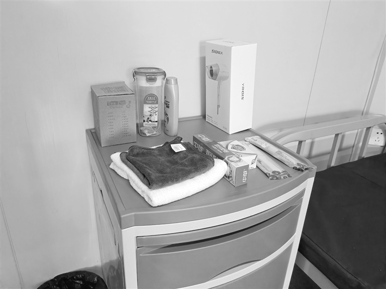 穿过通道进入隔离区,在18平方米的隔离房间内,灯光明亮,环境整洁。床头柜上摆放着电水壶、水杯,每张单人床都配置了全新的被褥。在完整的集成式卫浴间内,牙刷牙膏、香皂、毛巾、洗头膏、吹风机、拖鞋等生活用品配置齐全。不仅如此,工作人员介绍,每个单体房间项目建成后,全区域还将实现无线网络全覆盖,能满足隔离人员日常起居“一人一间一卫”及上网娱乐等需求。