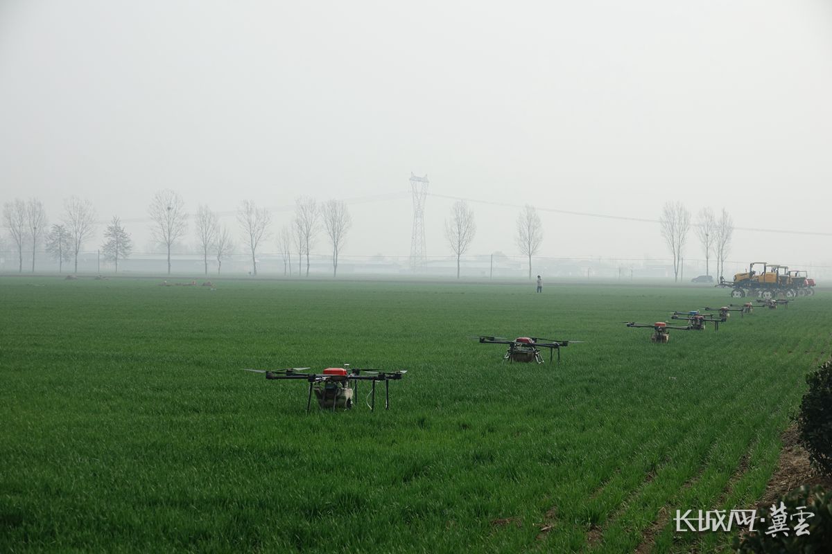 无人机和自走式喷雾机准备喷洒作业。长城网·冀云客户端记者 贾宏博 摄