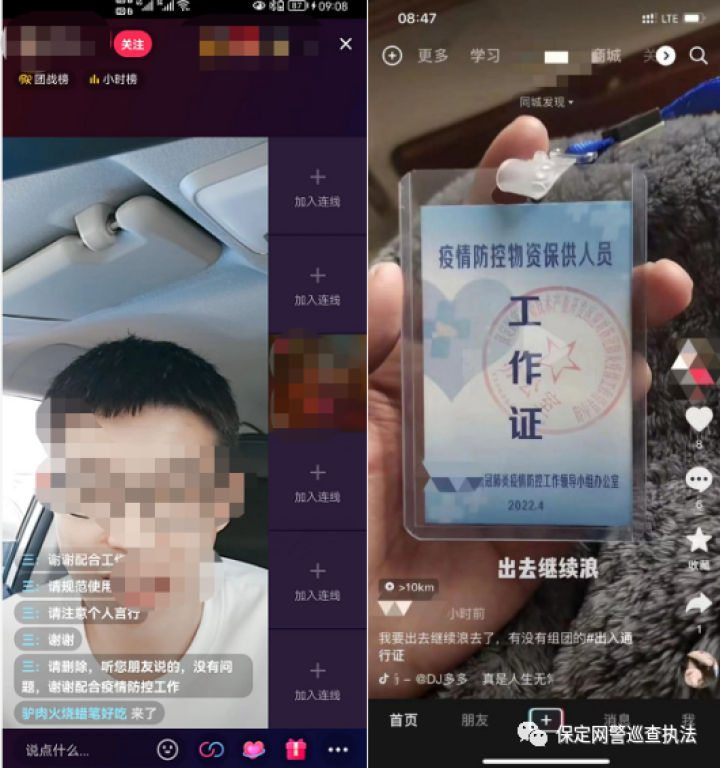 4月26日8时许,保定网警巡查发现,一网民发布手持疫情防控物资保供人员工作证的抖音短视频,并配文称“我要出去继续浪,有没有组团的”。随后该网民通过抖音进行直播,期间多名好心网民提醒其规范使用证件,请注意个人言行,配合疫情防控工作,但其均置之不理,严重扰乱了我市疫情防控工作秩序。