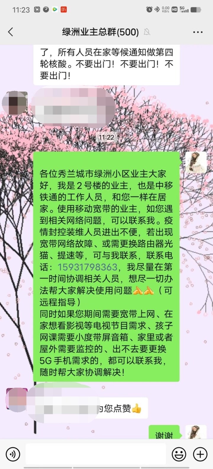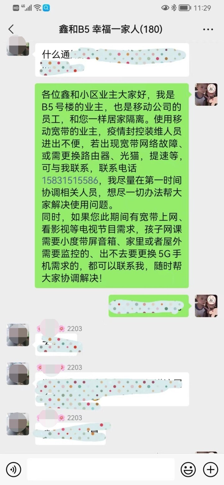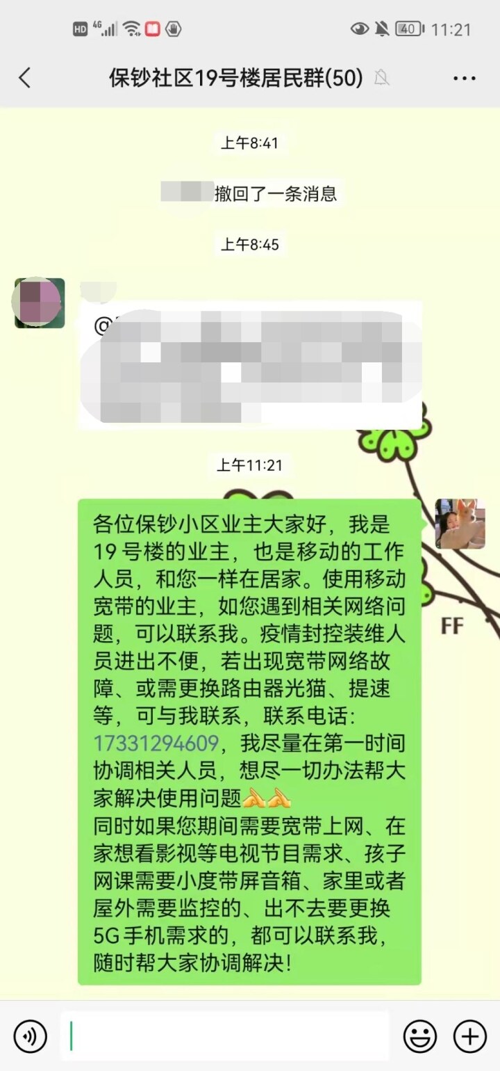 保定日报讯(通讯员 李晓扬)“各位小区业主,我是咱们小区的业主,也是保定移动员工。若出现宽带网络故障,可以联系我,我会尽力为大家解决问题,排除故障。”一条信息及时出现在小区业主微信群内,为因网络故障,不能居家办公、上网课的家庭带来希望。