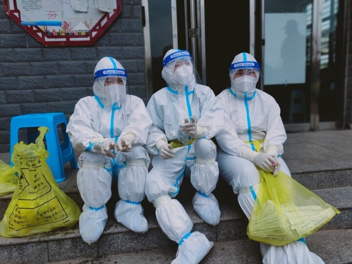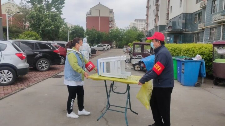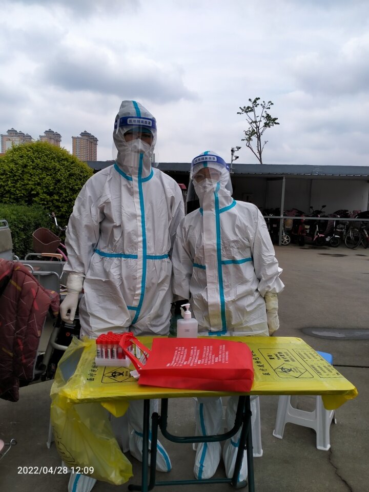 13时20分为大部分居民采集完后,医护人员和志愿者分批次爬楼上门入户为行动不便的老年人采集核酸,虽然今天的风很凉,但是穿着厚厚的防护服一层楼一层楼的入户,医护人员和志愿者还是出了一身汗。很累、很闷,但是为了完成核酸采样工作,大家咬咬牙都坚持下来了。志愿者们在帮忙搬桌子。王辛于 摄