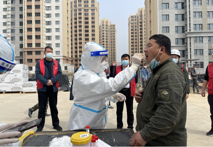 同时,迅速开展建筑工地全员核酸采样。据统计,满城区住建局共封控施工项目49个,人员625人。由于工程地点分散,为确保人员封控不聚集,按照区防控办安排,就近到社区、村进行采样。但部分工地封控人员较多,就近到社区(村)进行全员核酸采样存在困难。在医护人员非常紧张的情况下,区住建局果断协调2名医护人员,每天深入施工现场,为封控人员进行核酸采样。