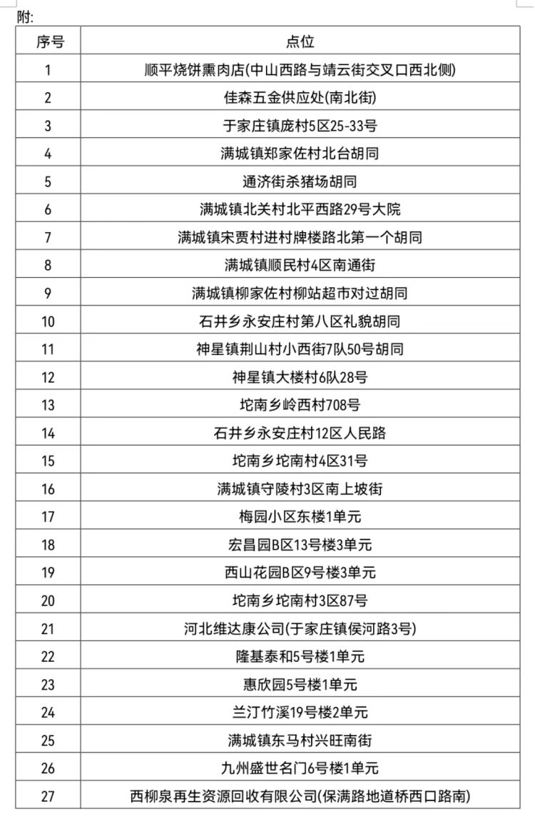 一、分级分区精准管理。对阳性感染者活动轨迹涉及的风险区域:中山西路与西二环交叉路口西北侧顺平烧饼熏肉店、保满路地道桥西口路南西柳泉再生资源回收有限公司(二手家具城)继续实行封控管理;对涉及的重点风险人员居住楼栋的单元(所在村的街区)继续实行“足不出户、服务上门”的封控措施,每天进行一次核酸检测;所在小区(村)实行“人不出小区(村)、严禁聚集”的管控措施,每两天进行一次核酸检测。解除时间视疫情情况另行公告。(名单附后)
