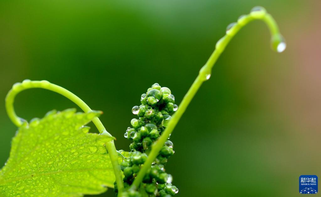 4月25日,在山东省邹平市南部山区,葡萄花序挂满雨露。