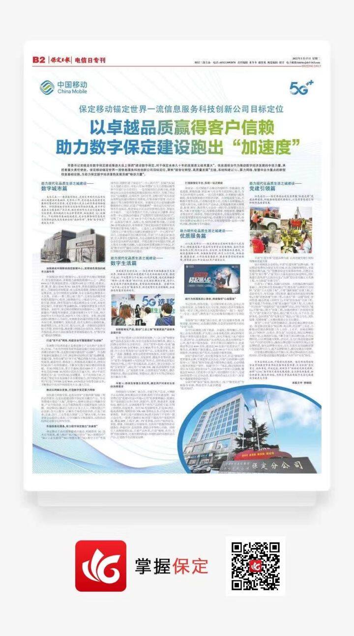 万里征程风正劲,千钧重任再扬帆。保定移动将继续坚决贯彻落实市委市政府各项决策部署,大力弘扬“崇信重义、尚和争先、开放包容、创新实干”的新时代保定精神,按照“12346”数字保定建设发展思路,全力推进新基建、融合新要素、激发新动能,为保定市高品质数字生活之城建设贡献更大力量。