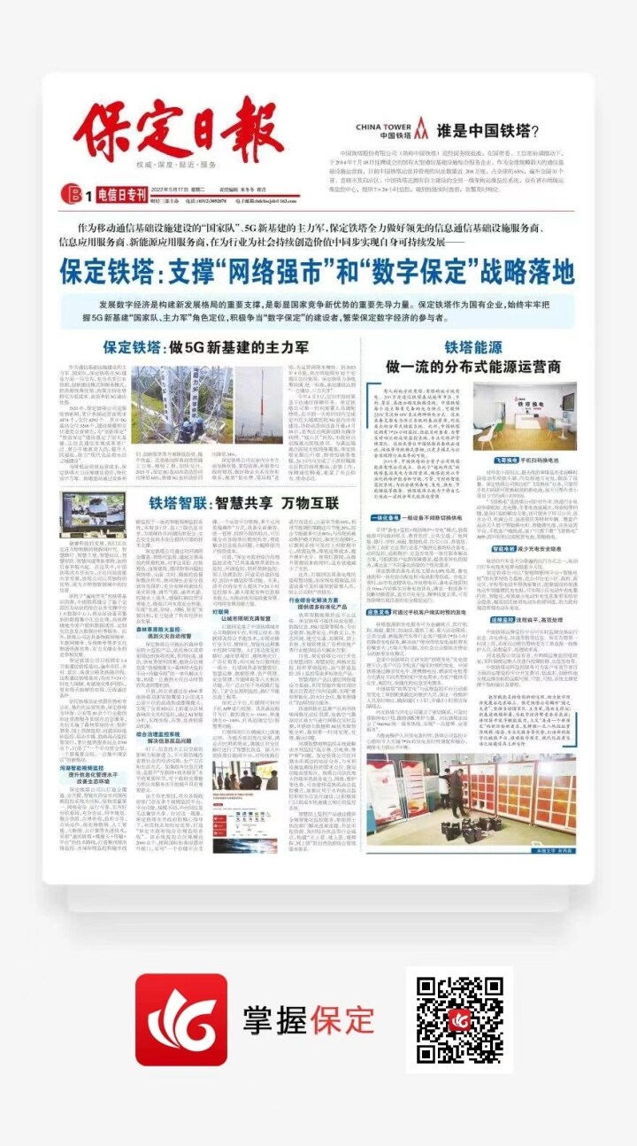 发展数字经济是构建新发展格局的重要支撑,是彰显国家竞争新优势的重要先导力量。保定铁塔作为国有企业,始终牢牢把握5G新基建“国家队、主力军”角色定位,积极争当“数字保定”的建设者,繁荣保定数字经济的参与者。