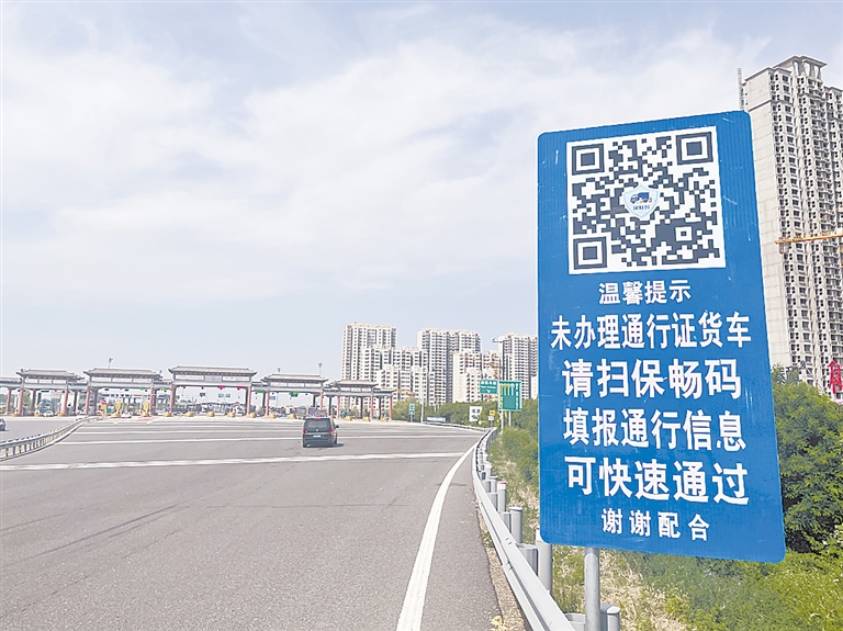 京石高速收费站在下道旁设置路牌,提醒货车司机提前扫码,以便提高通行效率。