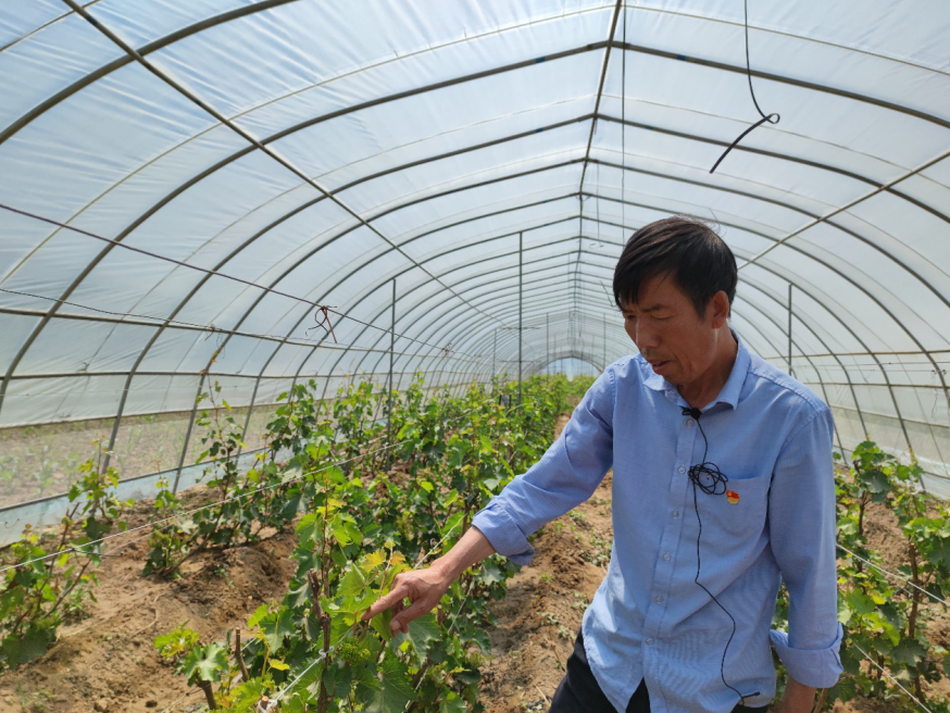 农户在大棚内查看葡萄长势