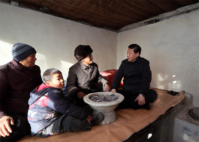 2012年12月29日至30日,中共中央总书记、中央军委主席习近平在河北省阜平县看望慰问困难群众。这是习近平在龙泉关镇骆驼湾村看望唐荣斌老人一家。新华社记者兰红光摄