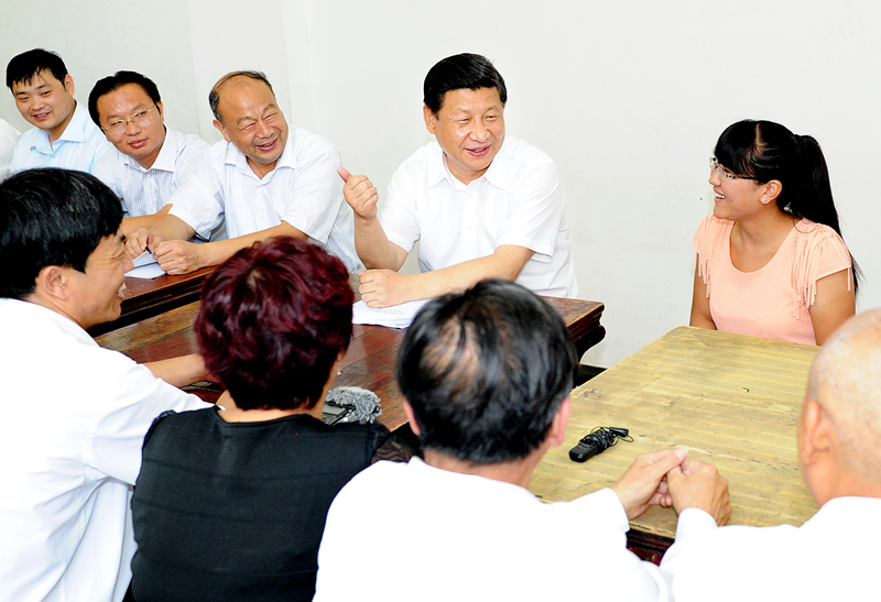 2013年7月11日至12日,中共中央总书记、国家主席、中央军委主席习近平在河北省调研指导党的群众路线教育实践活动。这是习近平在正定县塔元庄村社区综合服务中心看望镇村干部和村民。 新华社记者李涛摄
