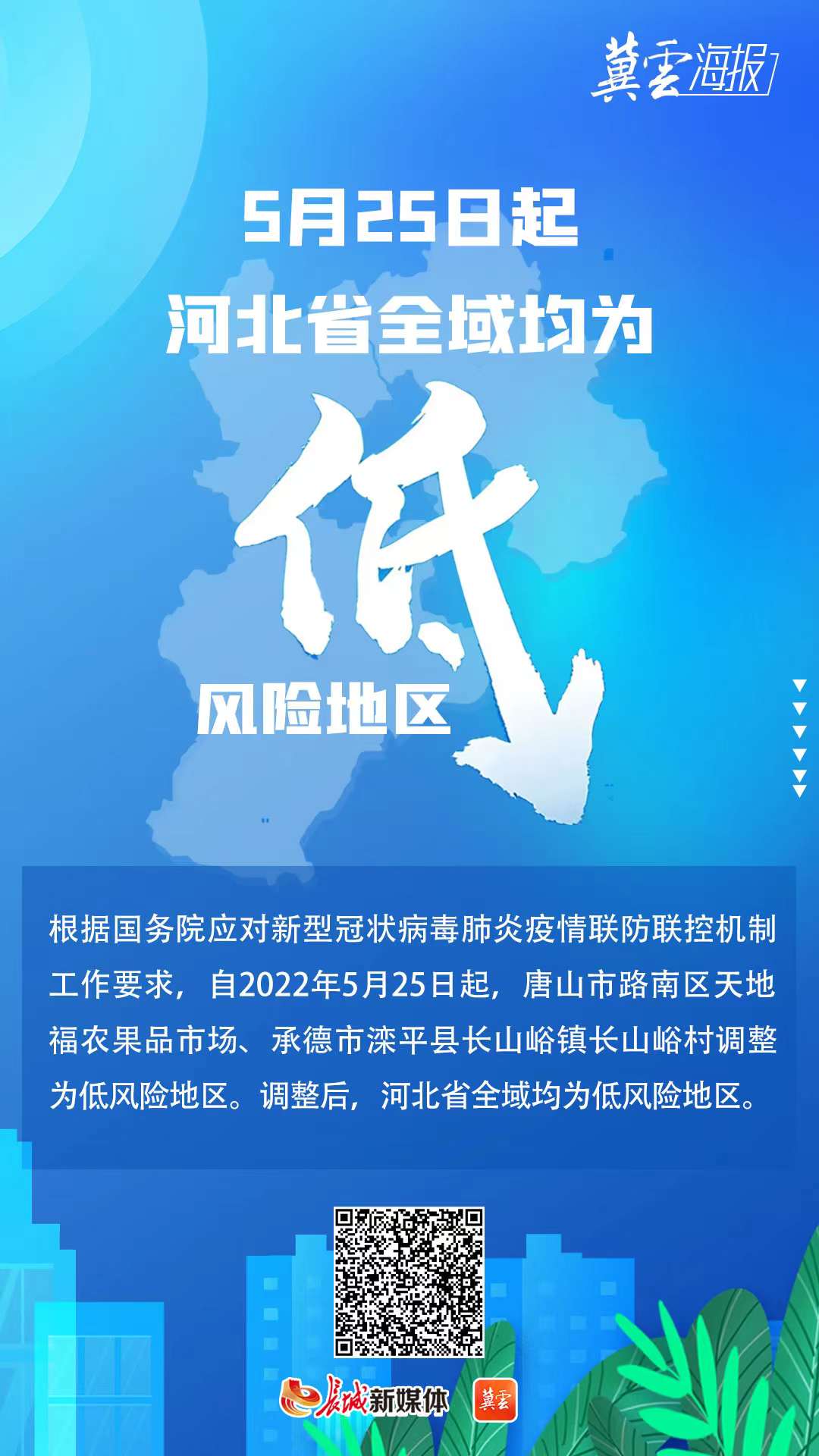 自2022年5月25日起,唐山市路南区天地福农果品市场、承德市滦平县长山峪镇长山峪村调整为低风险地区。调整后,河北省全域均为低风险地区。中高风险地区“清零”,这是本轮河北战“疫”的重大成果,提振士气,鼓舞信心。