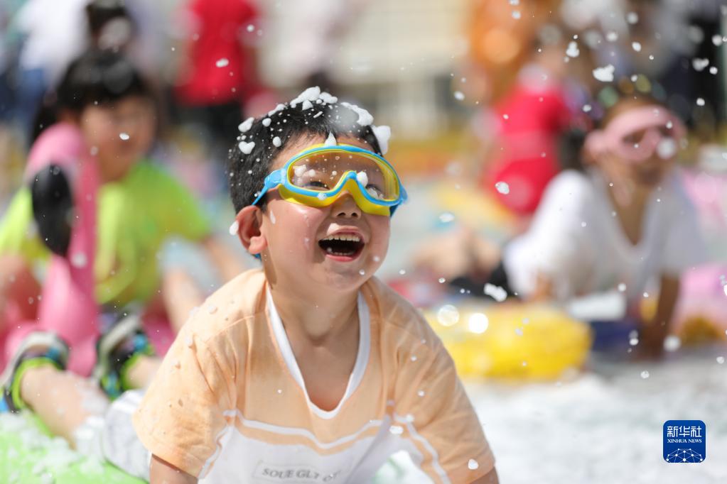 5月30日,在江苏省淮安市洪泽湖幼儿园迎“六一”活动中,小朋友们在参加“泡沫派对”活动。