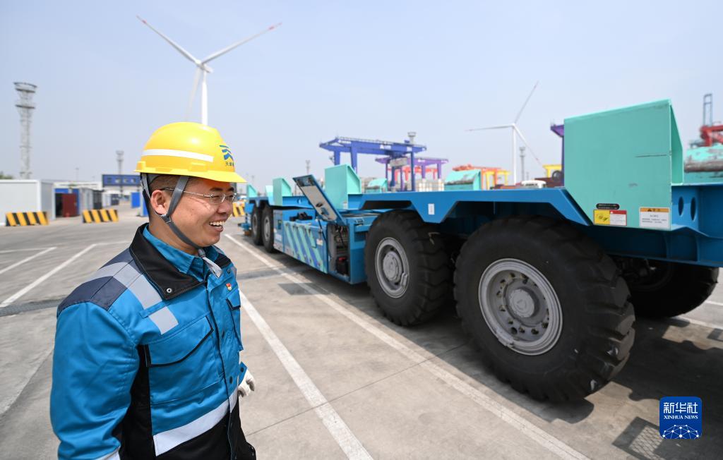 在天津港北疆港区C段智能化集装箱码头,全国劳动模范成卫东参观“水平运输机器人”(4月29日摄)。新华社记者 李然 摄