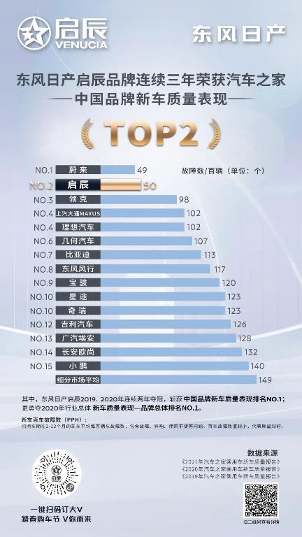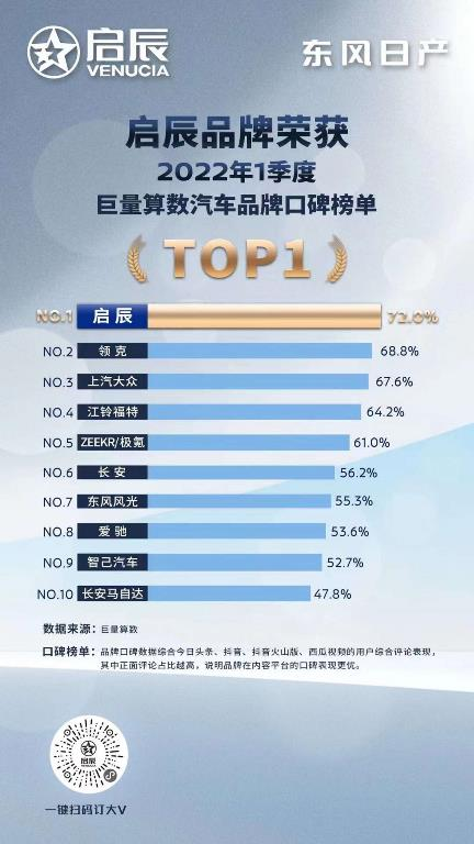 省油好开还耐用,好口碑也持续霸榜。得益于雷诺-日产-三菱联盟雄厚的技术支撑,东风日产启辰共享东风日产研发、制造等全价值链体系资源,沿袭世界领先的造车标准,旗下车型以优异的品质多次获得市场认可。在近日由巨量算数公布的《2022年1季度汽车品牌口碑榜单TOP20》中,启辰以72.0%的正面评论占比,排名榜单首位,再次证明启辰大V等车型的可靠品质。除此之外,在今年3月15日发布的2021年度《汽车之家乘用车新车质量报告》中,东风日产启辰排名中国品牌新车质量表现TOP 2。值得一提的是,这是继2019年、2020年连续获得《汽车之家乘用车新车质量报告》中国品牌新车质量表现排名NO.1后,启辰连续三年位居质量表现榜前两名。