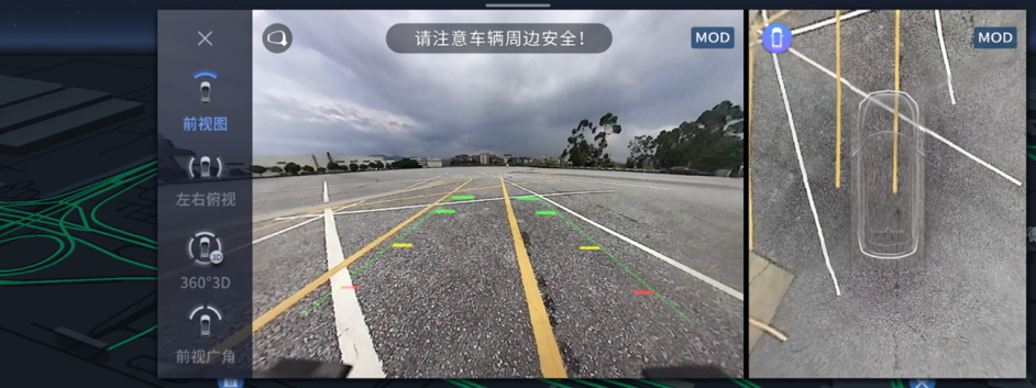 540°立体环视影像,也带来了不一样的体验。四个100万像素超清广角摄像头合成360°实时鸟瞰图,轻触屏幕即可切换镜头视角,满足不同方位的观察需求;180°透明底盘功能,可清晰显示障碍位置。当两项功能同时打开后,即可以上帝视角观察车辆下方路况,帮助车主消除了视野盲区,减少碰撞风险。