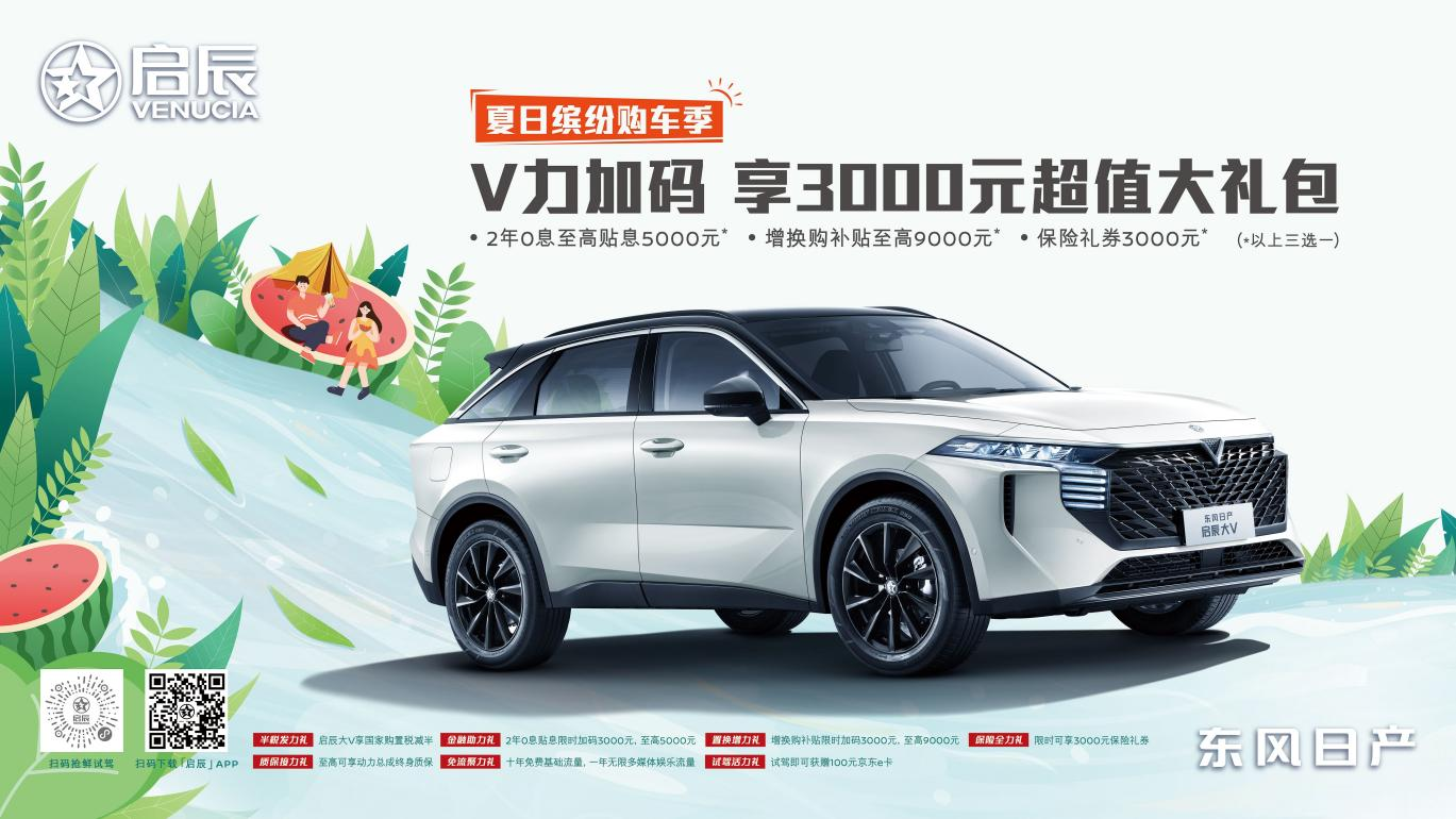 除了根据年轻人的特性去定制产品和服务,东风日产启辰积极响应国家购置税减半的政策,为消费者制定了“V力加码,享3000元超值大礼包”夏日缤纷购车季福利,以加码补贴,让用户购车无忧。购买东风日产启辰大V车型,不仅可享半税发力礼;还可享2年0息贴息限时加码3000元,至高5000元的金融助力礼、增换购补贴限时加码3000元,至高9000元的置换增力礼、限时3000元保险礼券的保险全力礼(以上三选一);以及至高可享动力总成终身质保的质保接力礼、十年免费基础流量,一年无限多媒体娱乐流量的免流聚力礼和100元京东e卡的试驾活力礼等加码好礼。