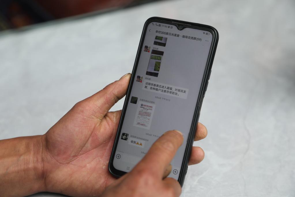 李珊珊展示“辛付村日光温室指导交流群”。 新华社记者马莎摄