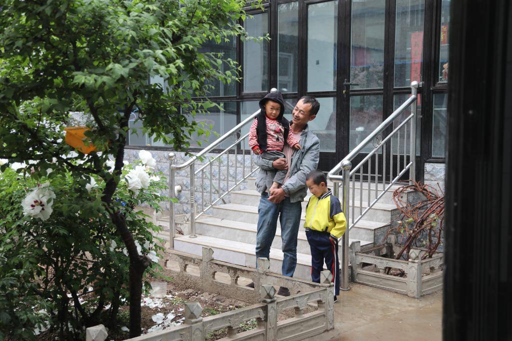 李珊珊带着两个孩子在新家小院玩耍。 新华社记者马莎摄