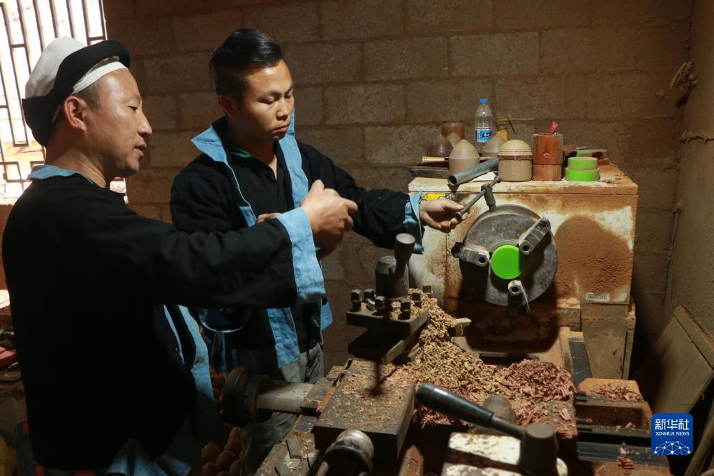 谢友明(左)跟徒弟在赶制陀螺(4月6日摄)。新华社记者 齐健 摄