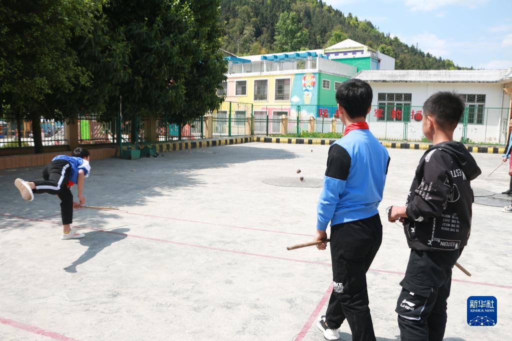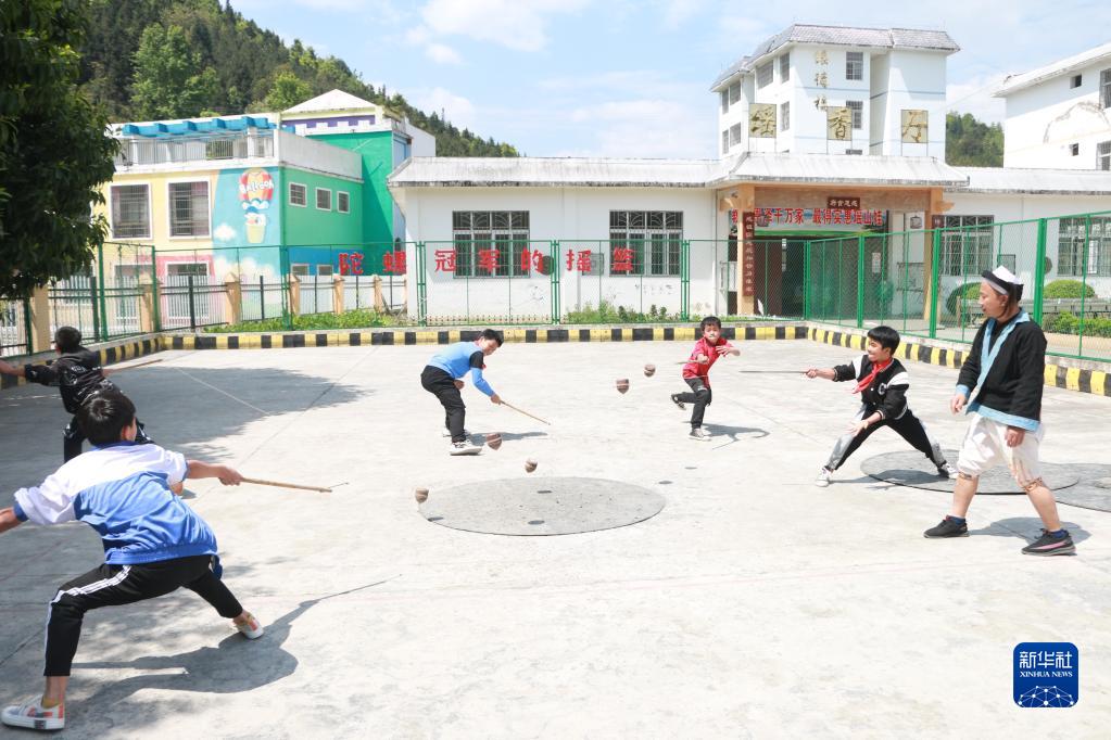 谢友明(右一)在指导瑶山民族小学的学生练习竞技陀螺(4月6日摄)。新华社记者 齐健 摄