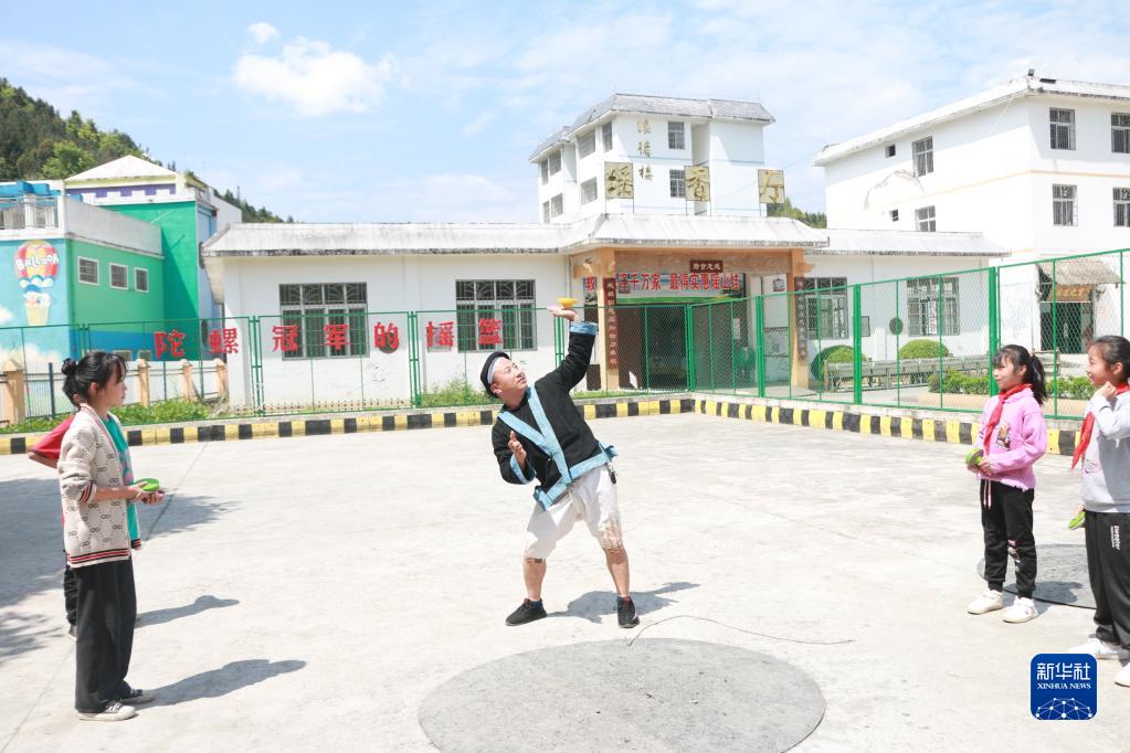 谢友明(中)在给瑶山民族小学的学生表演花式陀螺(4月6日摄)。新华社记者 齐健 摄