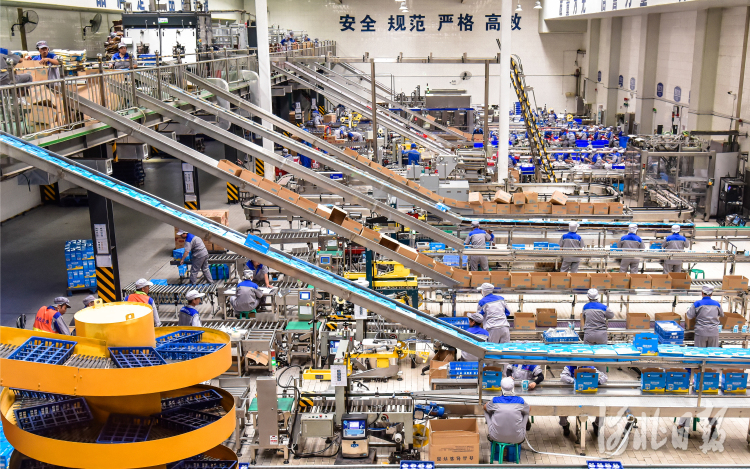 在位于石家庄市鹿泉区的君乐宝乳业集团车间,员工在生产线上进行作业。