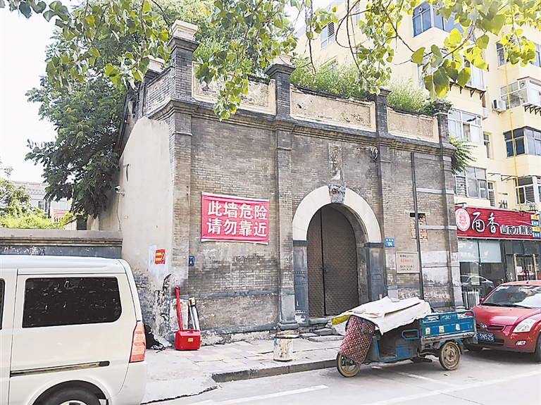 在满是居民楼的街道上,如果不是那一眼望去就极具年代感的青灰砖墙,不小心就会错过去。虽然蓝色门牌上写着的是琅瑚街106号,但斑驳的墙上挂着的“保定市重点保护民居 琅瑚街80号院”石牌,揭示着这里的价值。如今的琅瑚街80号院,外墙上的一大半雕花早已磨平,屋顶上也已长满杂草,四周的墙面也有些许裂缝。夏初的暖风里,古朴的大门紧锁着,专程而来的记者一行只能透过门缝,通过院内破败的房屋,想象着这个宅子曾经的精致与辉煌。