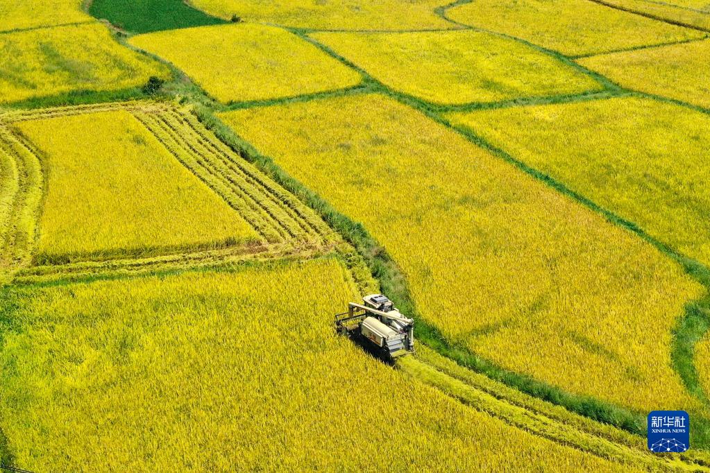 近日,水稻进入收获期,各地农民抓紧农时收获、晾晒稻谷。